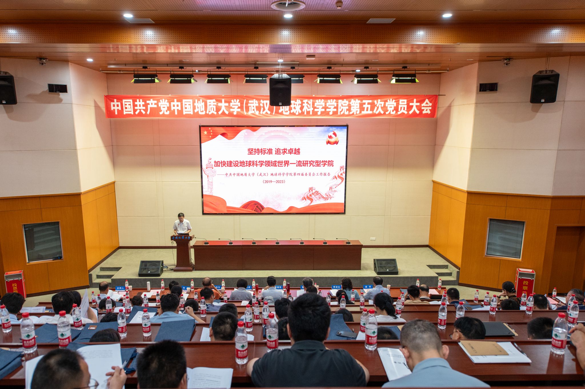 组织部部长陈文武首先宣读校党委关于同意地球科学mg冰球突破 党委召开第五次党员大会的批复文件。周刚同志代表mg冰球突破 党委第四届委员会作工作报告,他以“坚持标准、追求卓越,加快建设地球科学领域世界一流研究型mg冰球突破 ”为题,分三部分报告,一是过去五年的工作回顾,二是面临的形势分析,三是今后工作思路与举措。赵得爱同志作第一届纪委工作报告及党费收缴、使用和管理情况的报告。大会以举手表决的方式通过了周刚同志和赵得爱同志的报告。
