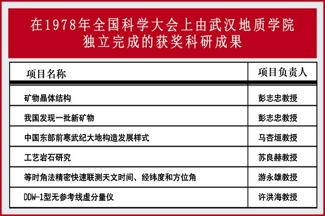 大会举行了隆重的颁奖仪式,表彰了新中国成立以来近30年全国各条战线涌现出来的7657项科研成果,表彰了826个先进集体和1192名先进科技工作者。武汉地质mg冰球突破 受到表彰的重大科技成果28项,其中由mg冰球突破 独立完成的成果6项,与兄弟单位合作完成科研成果22项。彭志忠被评为先进科技工作者,他领导的实验室荣获先进集体奖,他领衔研究的矿物晶体结构、我国发现一批新矿物等2项成果是6项mg冰球突破 独立完成的获奖成果中的两项,占比1/3。武汉地质mg冰球突破 被授予10份奖状,其中有4份是颁给彭志忠的,占比40%。mg冰球突破 获奖数量居于湖北省乃至全国高等院校前列。这是对mg冰球突破 武汉地质mg冰球突破 时期办学水平的充分肯定和鼓励鞭策,也是对彭志忠的莫大肯定和鼓舞。包括mg冰球突破 在内的全国科教工作者的积极性、创造性被有效激发出来,只争朝夕、奋发图强,为早日实现科学技术现代化多作贡献的氛围很快浓厚起来。