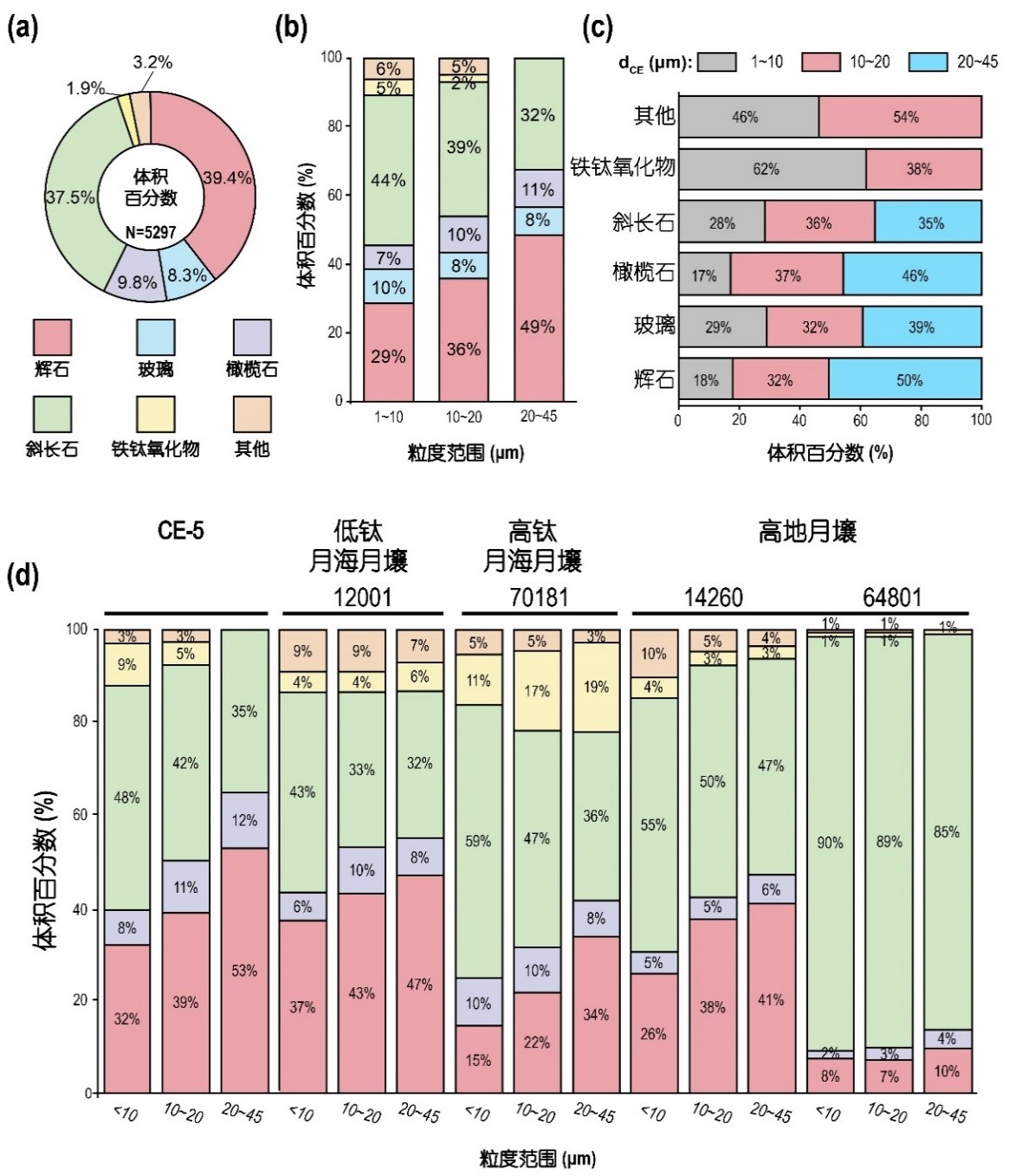 图4 嫦娥5号月壤的矿物组成(a-c)及其与阿波罗月壤对比(d)