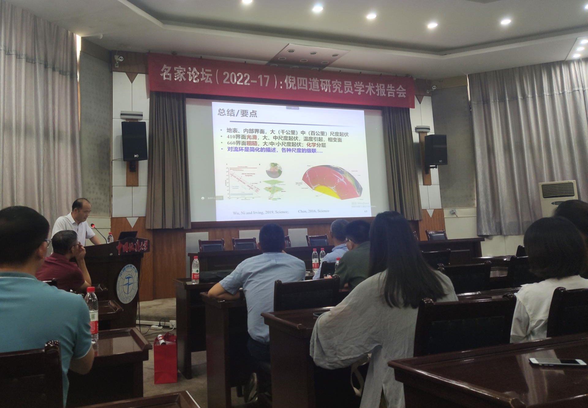 报告最后,倪四道研究员就在场师生提出的在信噪比不高的情况下如何辨别噪声和信号、如何比较原地表起伏和660界面起伏的粗糙度和尖锐度、在用散射波测量小尺度界面起伏时如何选取速度模型以及软流圈全球统一性等问题进行了详细的解答。