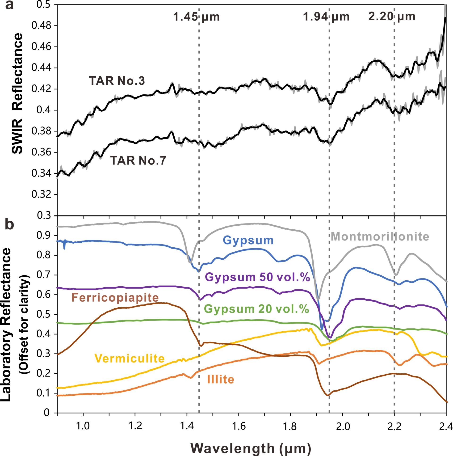 图3 “祝融号”获得的TAR表面多边形裂隙区域的原位光谱与实验室光谱的对比。可见TAR表面可能存在石膏等含水硫酸盐矿物