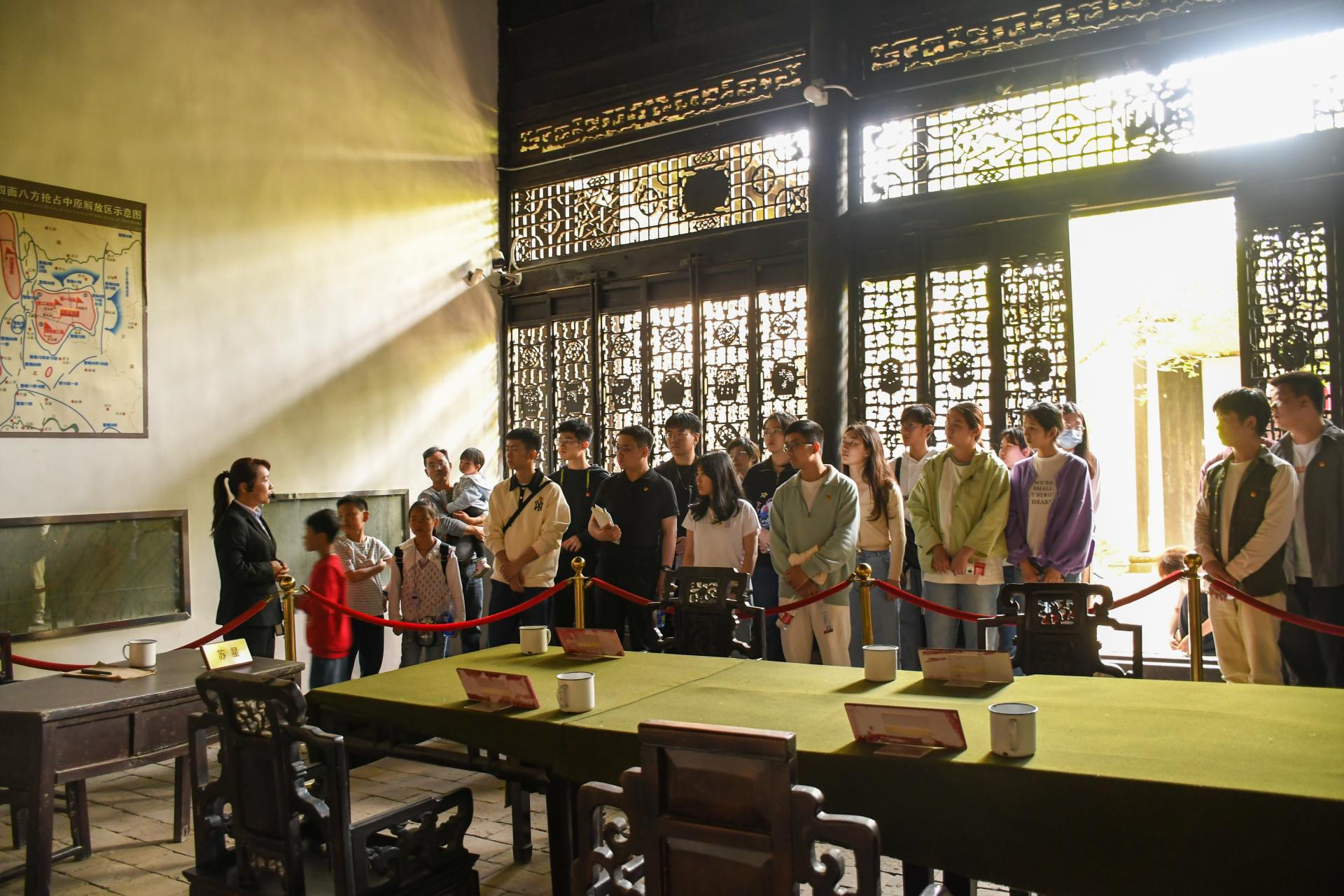 师生们向革命先烈三鞠躬表达敬意。结束纪念馆的学习参观,师生们来到周恩来与美、蒋代表谈判旧址。这里陈列着当时三方谈判代表的席位及有关图片和文字资料,展厅中的历史资料越过时空,陈述着这次谈判具有的重要历史意义,正是在这里,周恩来、李先念于1946年与美、蒋代表进行谈判,挫败了国民党的军事进攻阴谋。