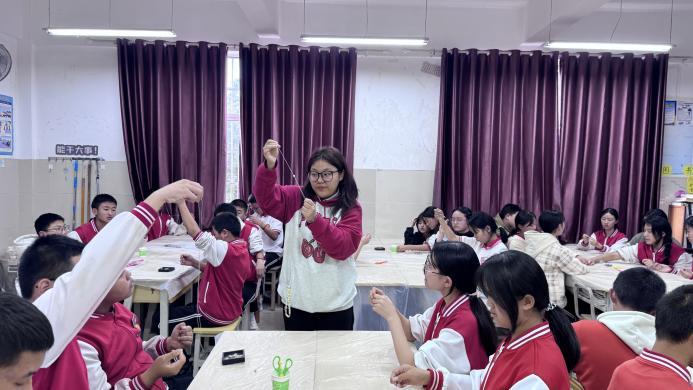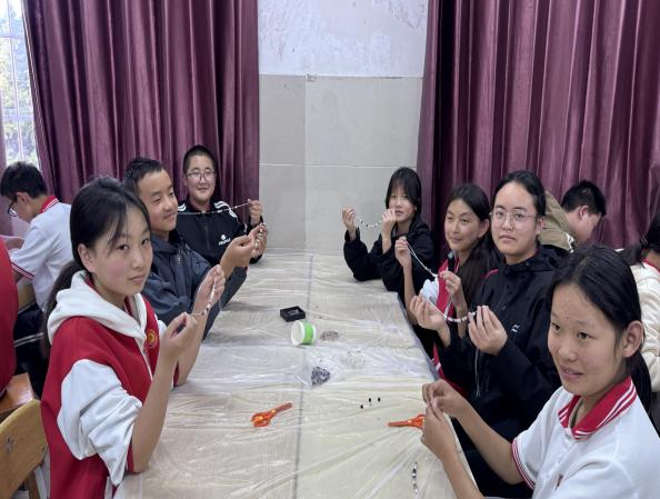 本班科普课堂后是DIY串珠手链体验活动,李槟馨在讲台上演示,罗明辉和支教团赵安然老师辅助在各个小组间逐一指导,学生们挑选了喜欢的颜色及矿物珠子原料,按照各自的手腕粗细,完成了自己独一无二的珠宝手链,在学思践悟中感悟珠宝矿物的魅力。