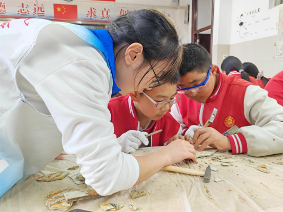 在科普讲座后的化石修复环节,同学们全副武装,佩戴好护目镜、戴好手套,自己动手,让千万年前的化石终得以再见天日,看着自己从岩石里“敲”出来的鱼化石都非常欣喜。在探索过程中,孩子们亲手体验观察、清灰、开凿等一系列化石发掘的流程,化身小小“考古家”,在实践中与数亿年前的生命对话,感悟生命演变的秘密。
