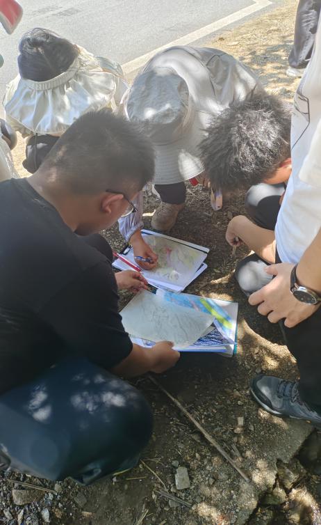 在填图过程中,王璐老师逐个检查了大家的填图成果,将大家各自在填图中存在的问题进行了现场答疑和指导,逐步消除了大家对填图过程中的各种疑点和困难;同时,她还对大家的成绩尤其是大一的同学出乎意料的填图成果进行了肯定。返回酒店前,王璐老师与大家相约晚饭前在酒店大厅现场答疑,指出存在哪些还可以进一步修改的地方。吃晚饭的过程中,大家挨个积极发言,回顾今天野外填图的收获,有意识地将课堂所学知识与野外实践内容建立联系,大家纷纷表明收获满满。之前觉得比较抽象的课题知识,通过实践变得这么有趣和生动!