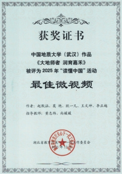 地球与行星科学mg冰球突破 在湖北省教育厅关工委“读懂中国”系列活动中喜获佳绩:mg冰球突破 获评mg冰球突破 2025年“读懂中国”活动优秀组织单位,由黄志炜、尚媛媛老师共同指导的微视频作品《大地师者 润育嘉禾》荣获2025年湖北省教育厅关工委“读懂中国”最佳微视频奖。