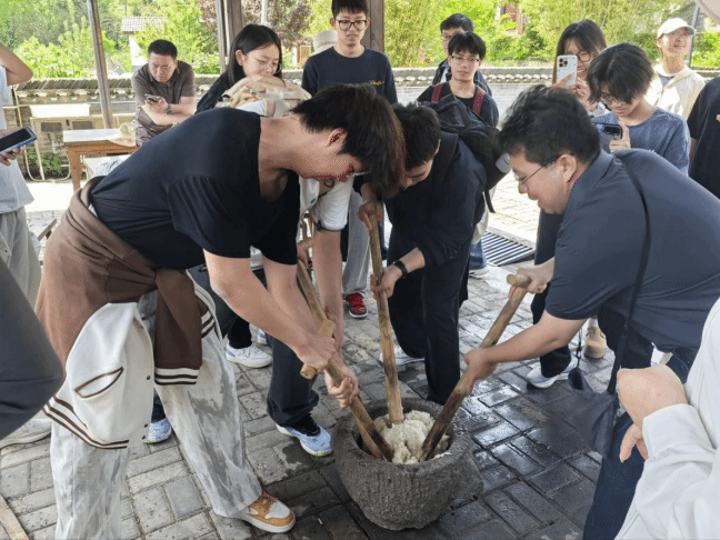从感人至深的故事中走出,师生们开展了打糍粑体验教学。木槌起落,糯米飘香,大家在协作劳动中感受着浓厚的乡土气息和“从群众中来,到群众中去”的深刻内涵。