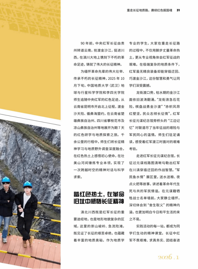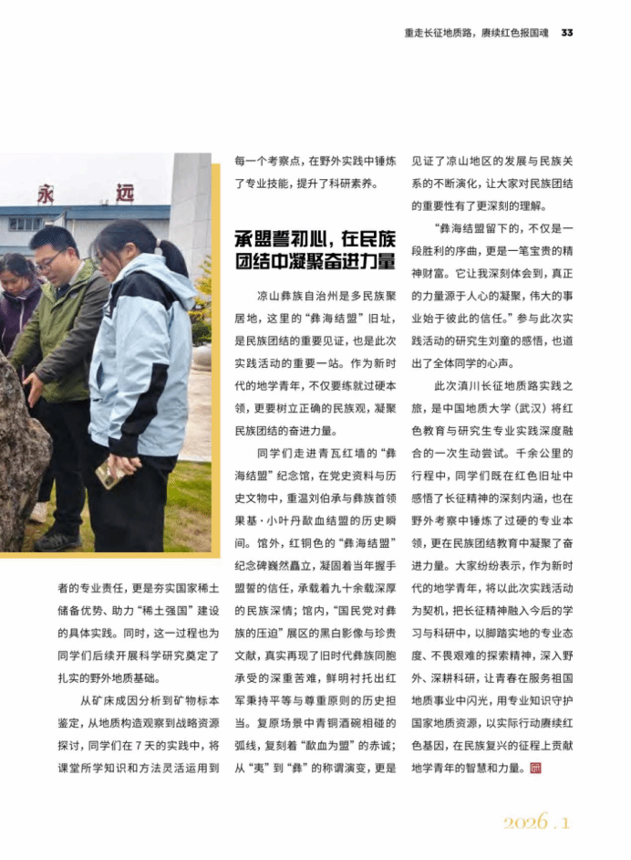 近日,《中国研究生》杂志以“重走长征地质路,赓续红色报国魂”为题报道mg冰球突破 师生赴云南、四川等地开展“重走长征地质路”实践活动。