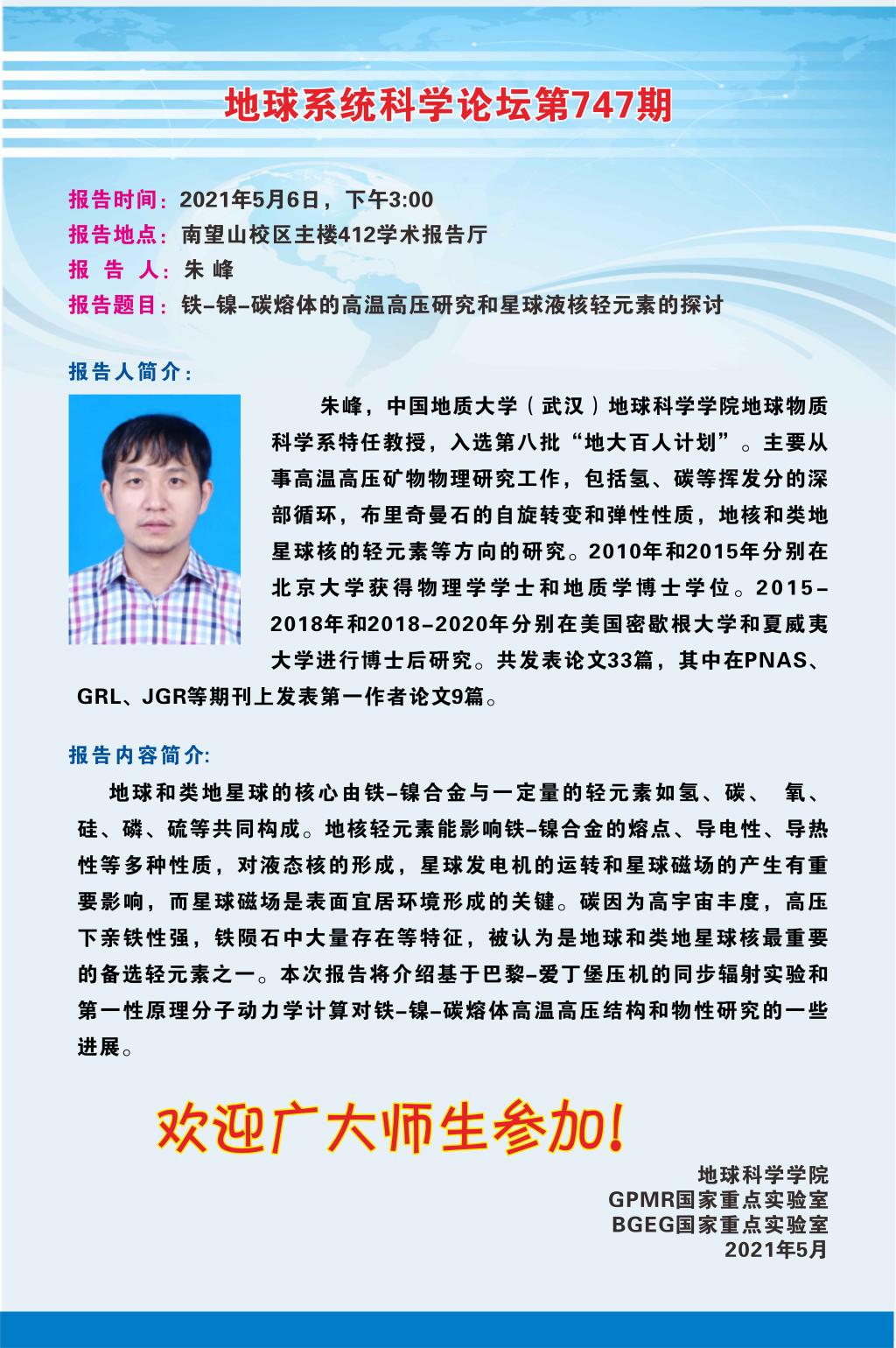 【5月6日】朱峰:铁-镍-碳熔体的高温高压研究和星球液核轻元素的探讨