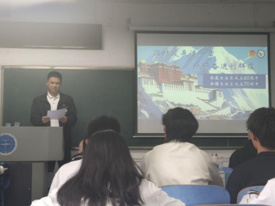 随后,团支部书记何海洋领学“六十年团结发展谱华章,新时代砥砺奋进创辉煌”专题内容。他以西藏自治区成立60周年、新疆维吾尔自治区成立70周年为背景,以西藏自治区为例介绍了民族共同体的融合和民族进步的成功实践。