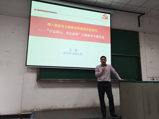 党课开始,按照相关要求开展了规定动作学习,并为赵璐璐、程柳菱、刘航、王雄、谢战军、付冬、王圆、黑贺堂等八位十月份入党的同志庆祝“政治生日”,邀请了程柳菱博士作为过“政治生日”党员代表,带领全体党员领学《党章》中“党的纪律”部分内容。她号召全体党员同志要严守党的纪律,服务师生,自觉发挥党员先锋代表模范作用。按照主题党日安排,王珩向全体党员布置开展“对照党章党规找差距”专题会议并进行校史校情主题教育等内容。